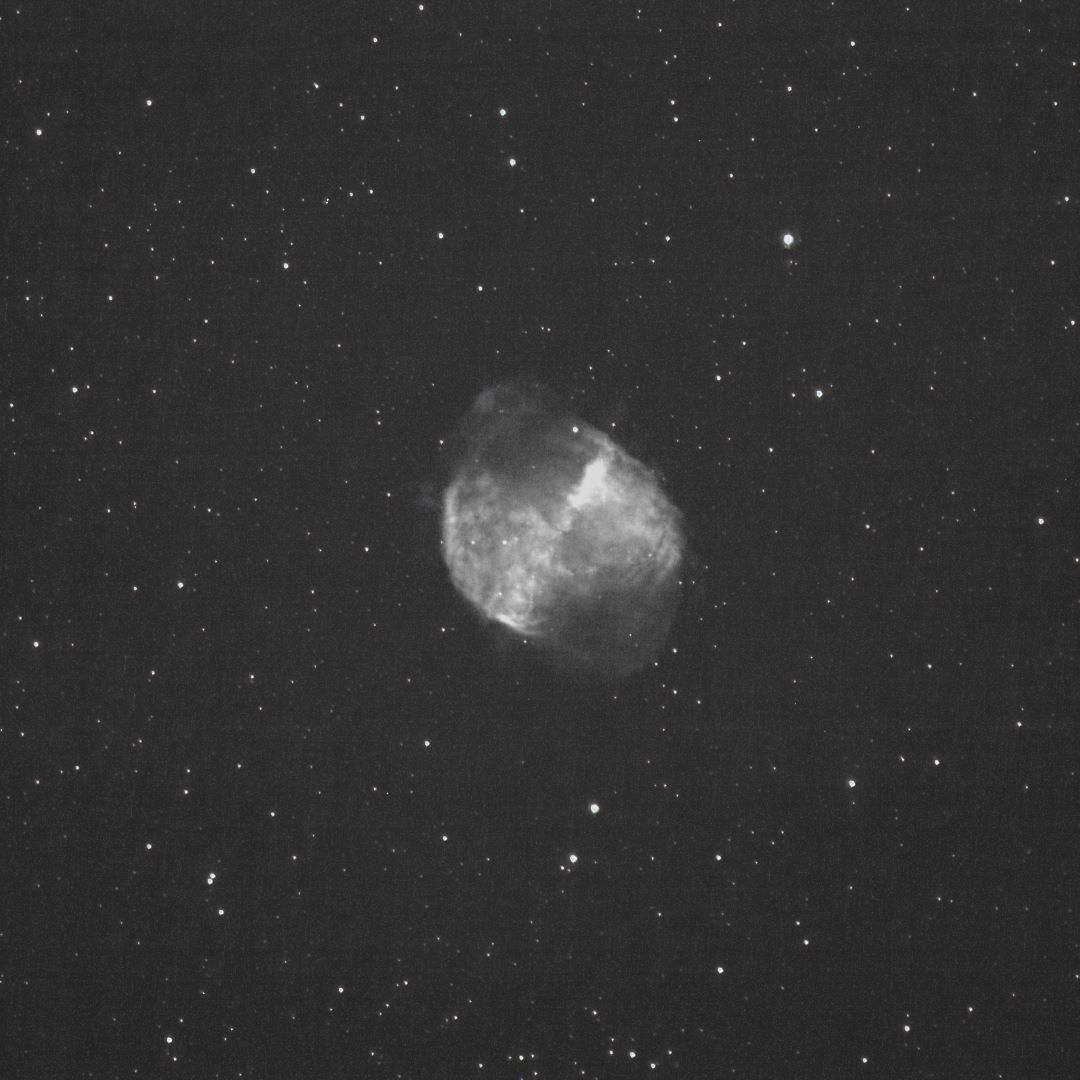 Planetary Nebula RA:19 59.6 DEC:+22 43 Vulpecula Mag. 7.3 Classe 3(2) Surf.Brigh.11.2 Dist.0,376Kpc NGC6853,PK 60-3.1,CS=13.9, Dumbbell nebula PK60-3.1;Lord Rosse drew 18* invl very large INTES ALTER M500 Fl:1270.0mm ZWO ASI294MM Pro T:-4.9 Gain:250 Filter: Ha Exp:600s Airmass 0.0 Moon 5.3gg 16.4% ill. (331) |