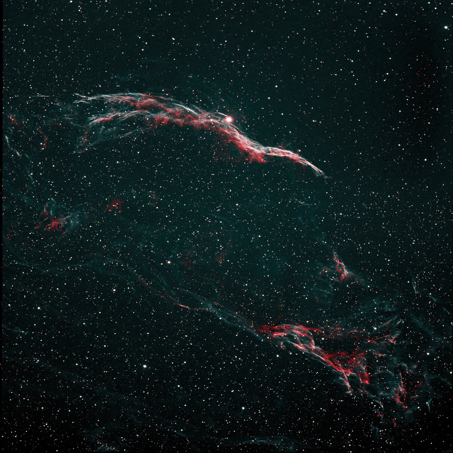 Very remarkable Pretty Bright, Considerably large, Extremely Irregular figure, 52 Compressed yGradually Involved, involving Supernova Remnant RA:20 45.7 DEC:+30 43 Cygnus Mag. 7.0 Dist.0,45Kpc LBN 191,Veil nebula H V 15;Veil Nebula western part;* 52 CYG invl pretty bright CELESTRON RASA 8" f/2 Fl:399.4mm ZWO ASI294MM Pro T:-10.0 Gain:300 Filter: Ha 1x900s OIII 1x900s Airmass 1.0 Moon 4.3gg 16.4% ill. (45) |