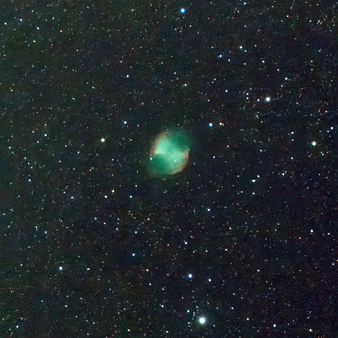 Planetary Nebula RA:19 59.6 DEC:+22 43 Vulpecula Mag. 7.3 Classe 3(2) Surf.Brigh.11.2 Dist.0,376Kpc NGC6853,PK 60-3.1,CS=13.9, Dumbbell nebula PK60-3.1;Lord Rosse drew 18* invl very large TAKAHASHI FS-60CB Fl:299.0mm ZWO ASI533MC Pro T:-10.0 Gain:300 Filter: LPRO Exp:90s Airmass 1.3 Moon 27.8gg 7.9% ill. (186) |