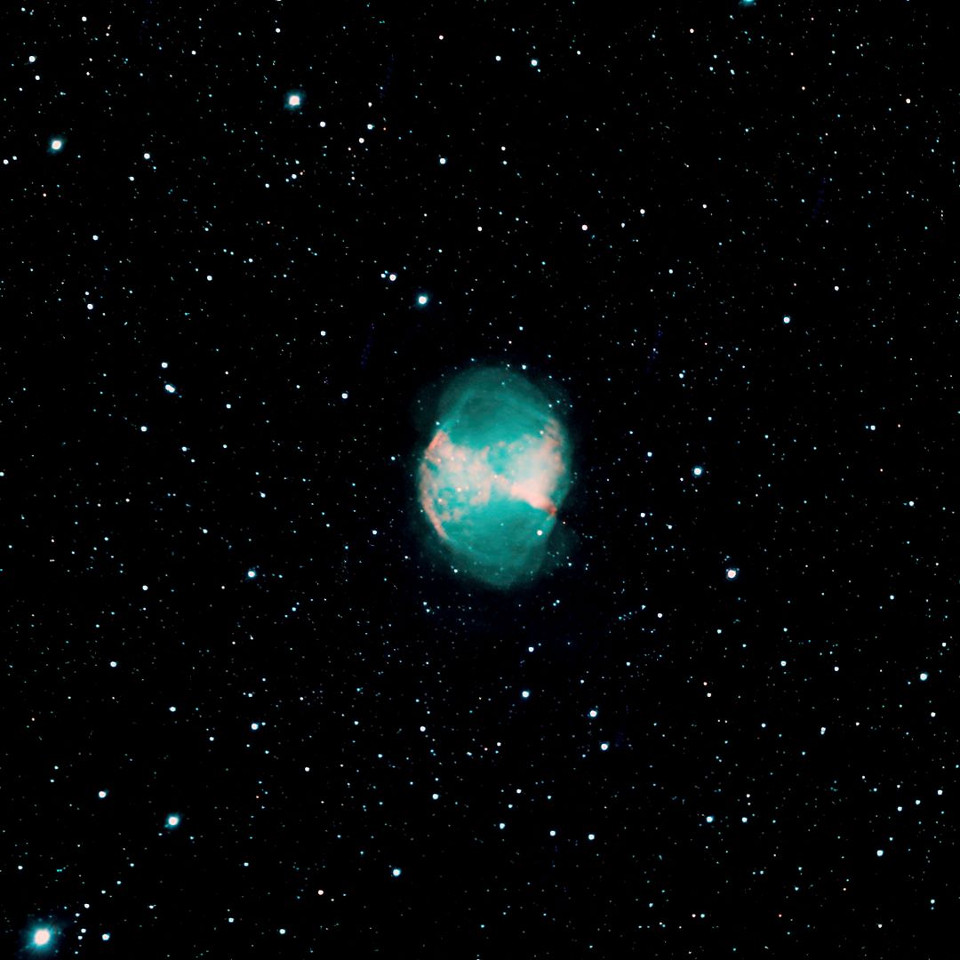Planetary Nebula RA:19 59.6 DEC:+22 43 Vulpecula Mag. 7.3 Classe 3(2) Surf.Brigh.11.2 Dist.0,376Kpc NGC6853,PK 60-3.1,CS=13.9, Dumbbell nebula PK60-3.1;Lord Rosse drew 18* invl very large RASA 8 Fl:400.0mm ZWO ASI533MC Pro T:4.9 Gain:300 Filter: None Exp:1800s Airmass 1.4 Moon 27.3gg 10.4% ill. (237) |