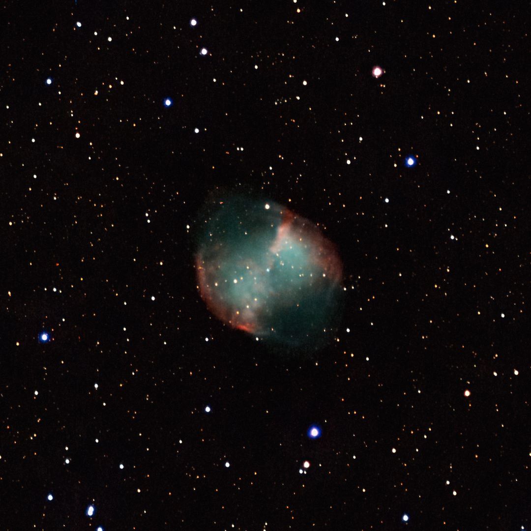 Planetary Nebula RA:19 59.6 DEC:+22 43 Vulpecula Mag. 7.3 Classe 3(2) Surf.Brigh.11.2 Dist.0,376Kpc NGC6853,PK 60-3.1,CS=13.9, Dumbbell nebula PK60-3.1;Lord Rosse drew 18* invl very large BORG 101ED f/6.3 Fl:640.0mm ZWO ASI533MC Pro T:-4.8 Gain:196 Filter: IR Exp:2x600s Airmass 0.0 Moon 21.8gg 67.7% ill. (335) |