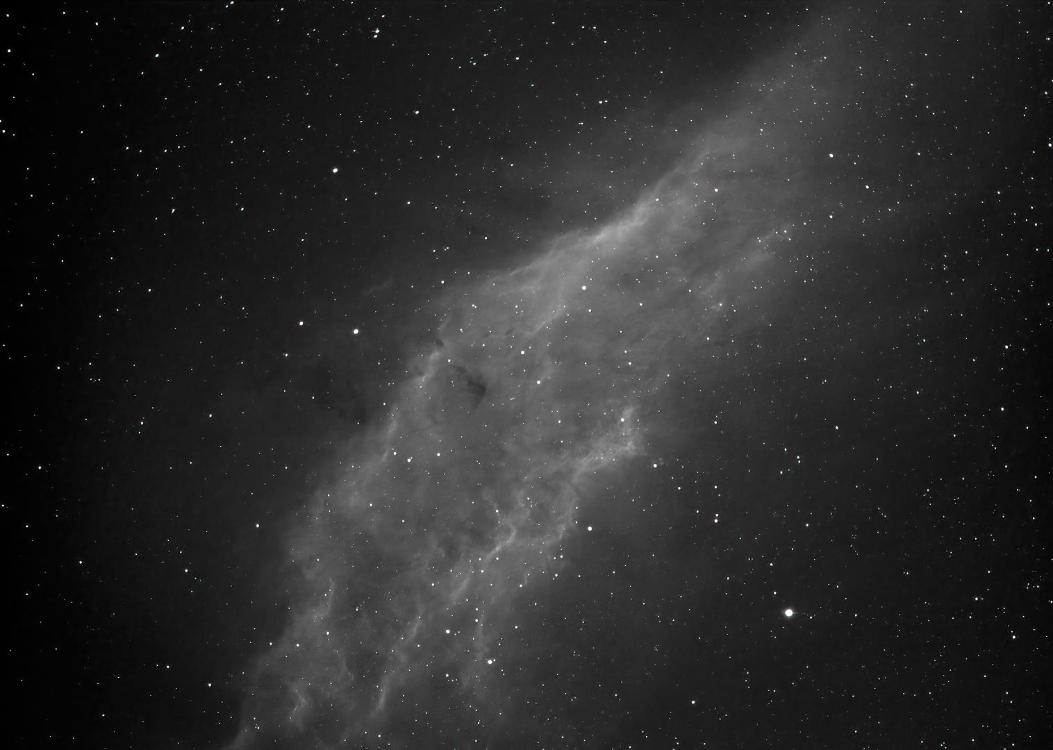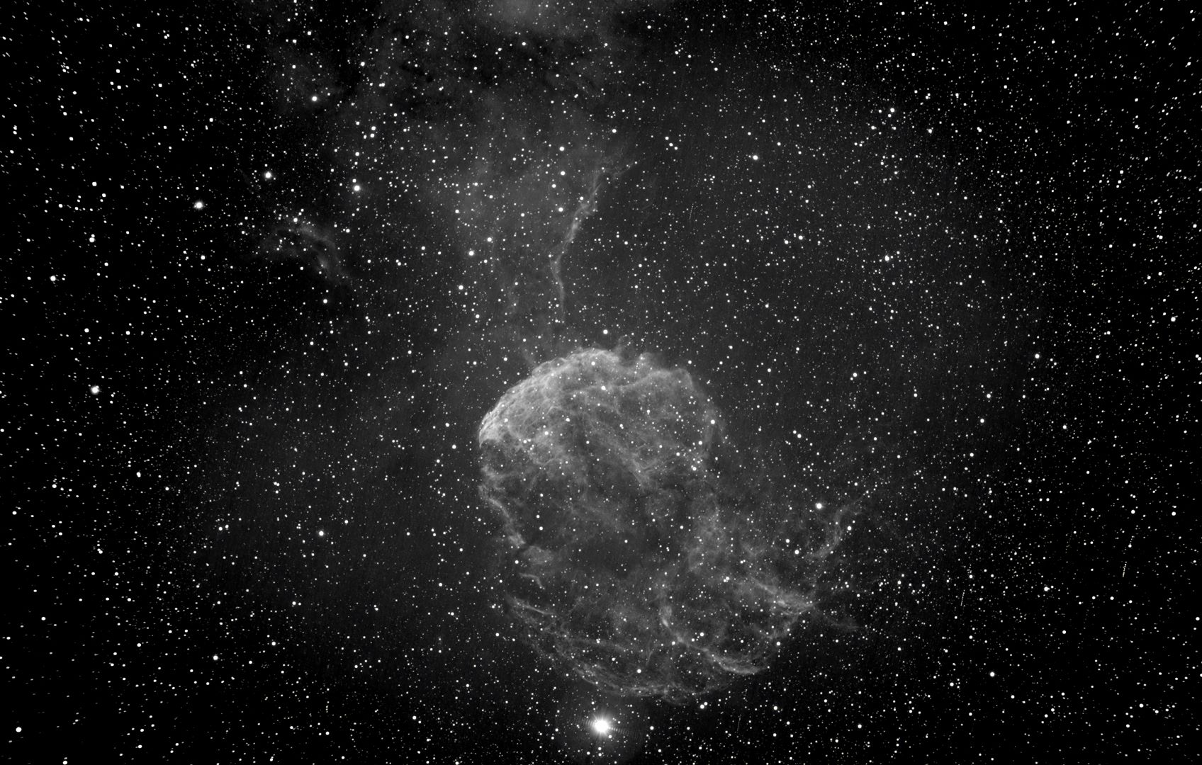 Faint, North aPartially resolved, some stars seen ow, curved Supernova Remnant RA:06 17.2 DEC:+22 31 Gemini Mag.12.0 Dist.1,5Kpc LBN 844,VMT 9,Sh2-248 vF;vL;arc 25'x5';filamentary structure faint RASA8 Fl:400.0mm ZWO ASI294MM Pro T:6.8 Gain:200 Filter: None Exp:12x300s Airmass 0.0 Moon 24.0gg 44.8% ill. (416) |