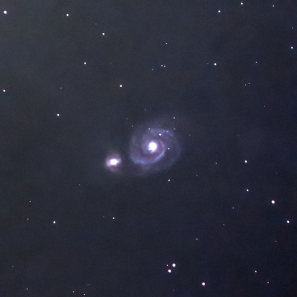 Galaxy RA:13 29.9 DEC:+47 12 CVN Mag. 8.4 Classe Sbc Surf.Brigh.12,9 Redshift Z=0,001544 Speed 463 km/s Dist.8,6Mpc PGC 47404 NGC5194,UGC 8493,MCG 8-25-12,IRAS 13277+4727,KCPG 379A,CGCG 246-8,Arp 85,VV 1,VV 403,Whirlpool galaxy SHARPSTAR 65Q f/6.5 Fl:423.9mm ZWO ASI533MC Pro T:-10.0 Gain:196 Filter: None Exp:420s Airmass 1.1 Moon 5.0gg 17.9% ill. (298) |