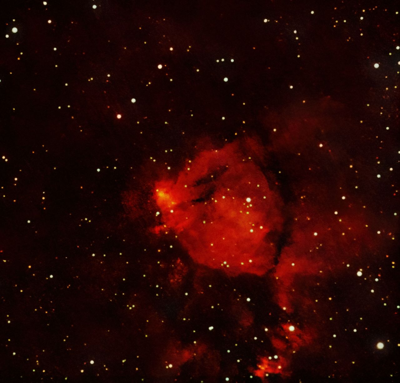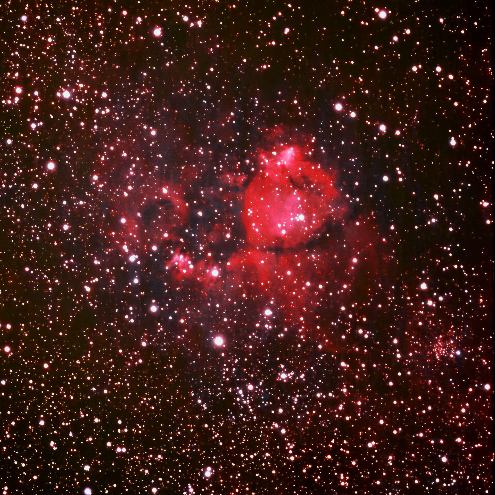 Preceding (westward) atChevelure of Nebulosity Bright Nebula RA:02 25.8 DEC:+61 59 Cassiopeia Mag.99.9 Classe E Dist.2,3Mpc NGC 896,LBN 645,CED 6,SG 1.04,Min 2-57,narrrow dark lane n-s, SNR ? Brightest portion of IC 1805;vast neby incl cluster Mel 15 very large faint ASKAR 185 APO f/7 Fl:1290.4mm Flattener ASKAR ZWO ASI294MM Pro T:-9.4 Gain:300 Filter: C1 Exp:11x660s Airmass 1.2 Moon 23.8gg 42.5% ill. (807) |