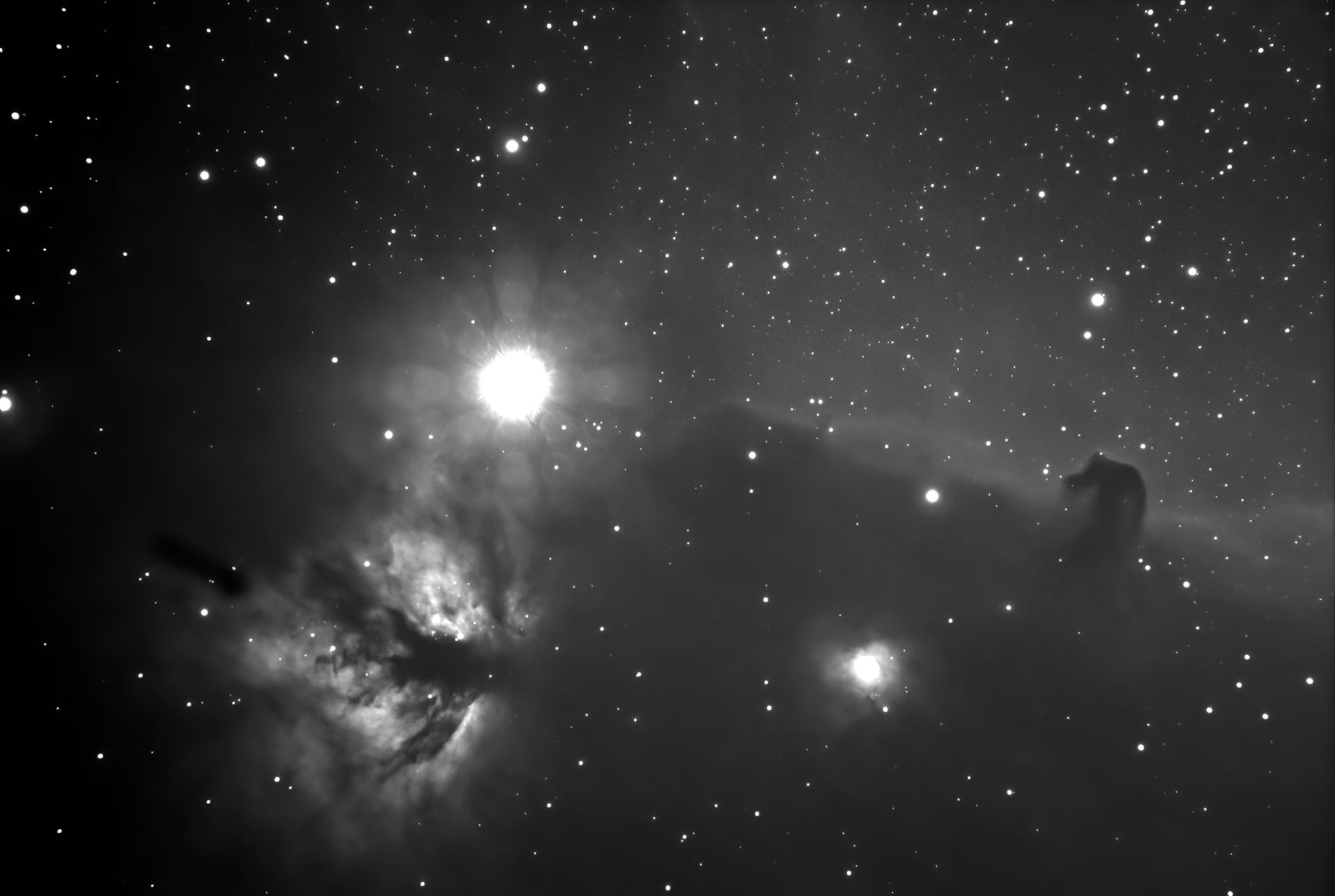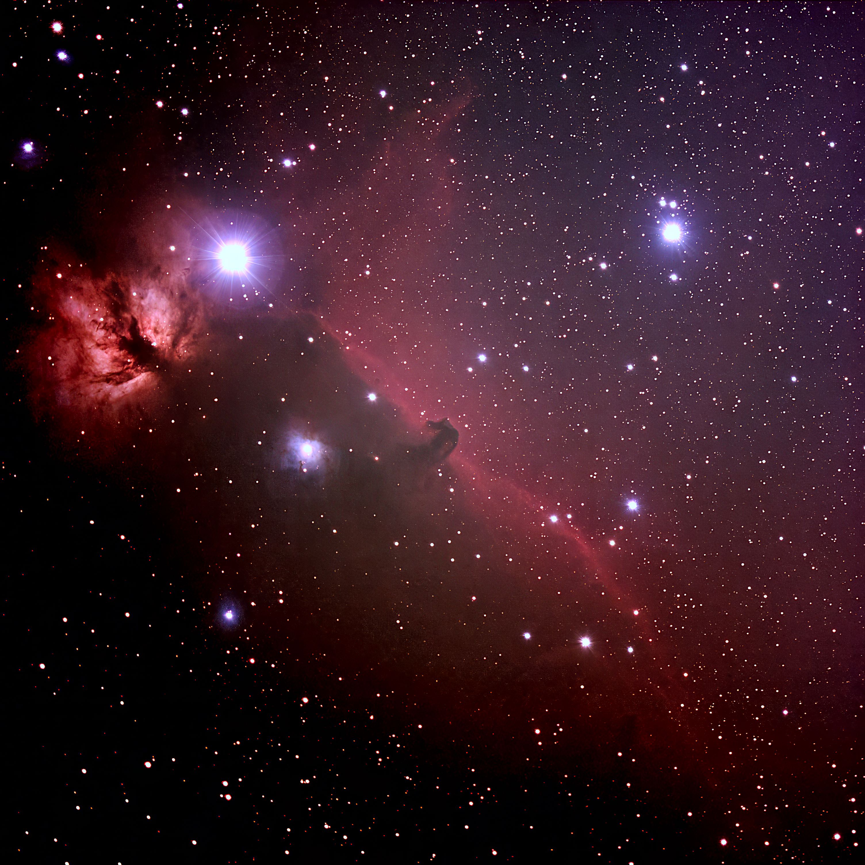 Nebula, 60' Little, South outh Following (eastward) Resolvable (mottled, not resolved) oMagnitude zExtremely ta OResolvable (mottled, not resolved) Irregular Bright Nebula RA:05 41.0 DEC:-02 27 Orion Mag.11.0 Classe E Dist.0,46Kpc LBN 953,CED 55N,Horsehead nebula Contains Horsehead neb (B33) degrees AP105 Fl:784.0mm ZWO ASI183MM T:16.5 Gain:200 Filter: _SKYGLOW Exp:12x300s Airmass 1.5 Moon 10.8gg 75.1% ill. (513) |