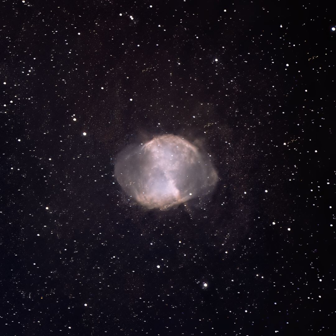 Planetary Nebula RA:19 59.6 DEC:+22 43 Vulpecula Mag. 7.3 Classe 3(2) Surf.Brigh.11.2 Dist.0,376Kpc NGC6853,PK 60-3.1,CS=13.9, Dumbbell nebula PK60-3.1;Lord Rosse drew 18* invl very large ASTRO-PHYSICS 105 TRAVELER EDF f/5.8 Fl:623.0mm ZWO ASI533MC Pro T:-7.6 Gain:300 Filter: None Exp:3x900s Airmass 1.3 Moon 6.8gg 40.1% ill. (82) |
