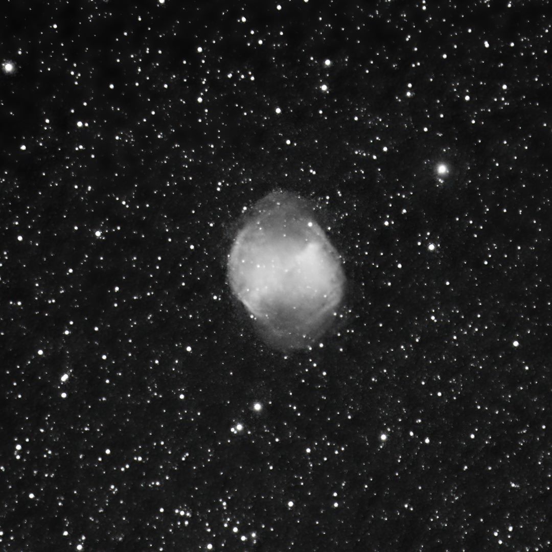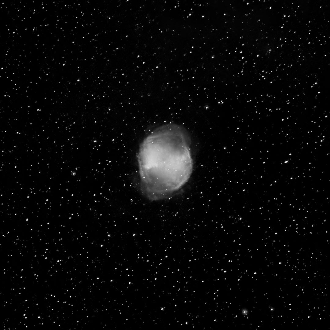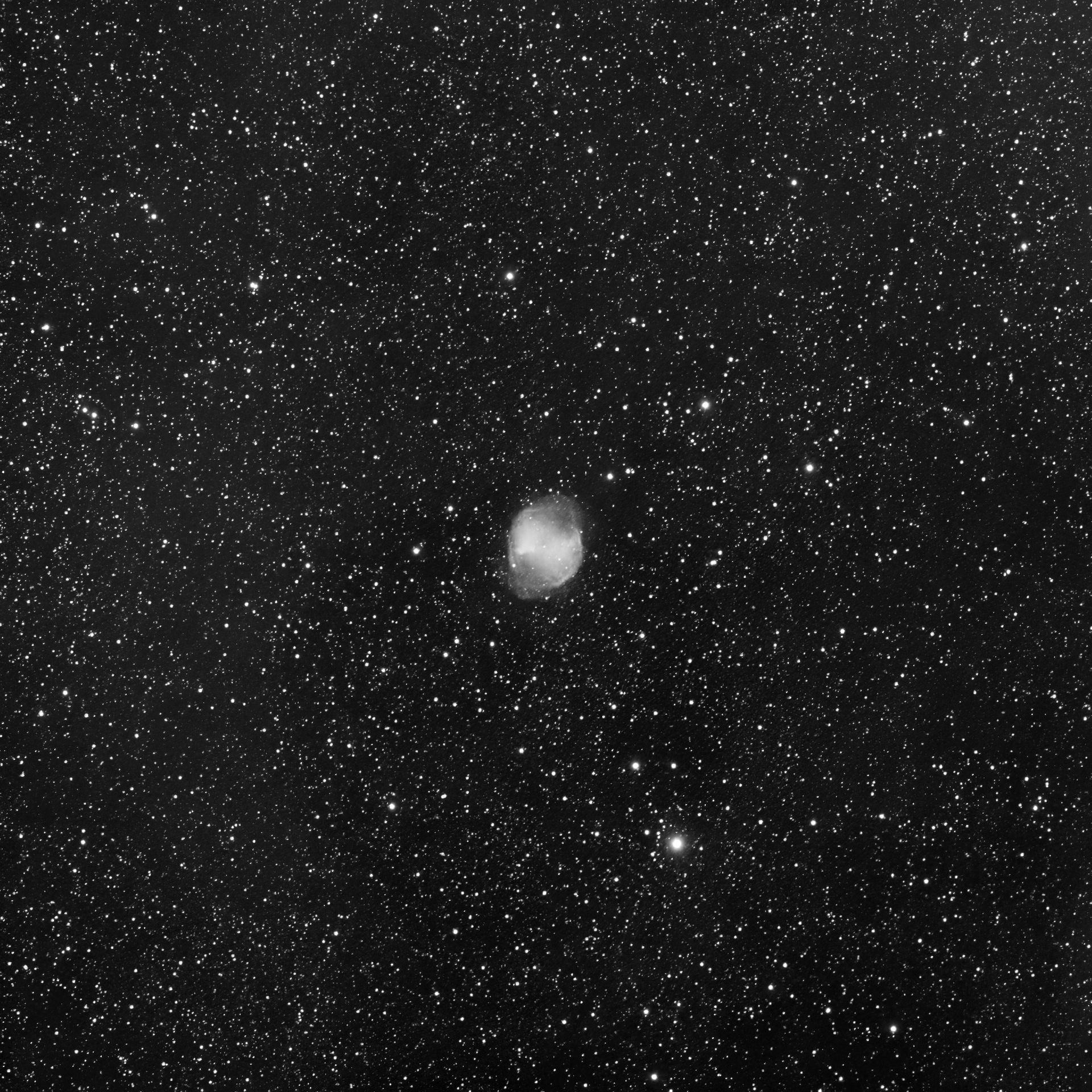 Planetary Nebula RA:19 59.6 DEC:+22 43 Vulpecula Mag. 7.3 Classe 3(2) Surf.Brigh.11.2 Dist.0,376Kpc NGC6853,PK 60-3.1,CS=13.9, Dumbbell nebula PK60-3.1;Lord Rosse drew 18* invl very large INTES ALTER M500 Fl:1270.0mm ZWO ASI294MM Pro T:-4.9 Gain:250 Filter: Ha Exp:600s Airmass 0.0 Moon 5.3gg 16.4% ill. (331) |