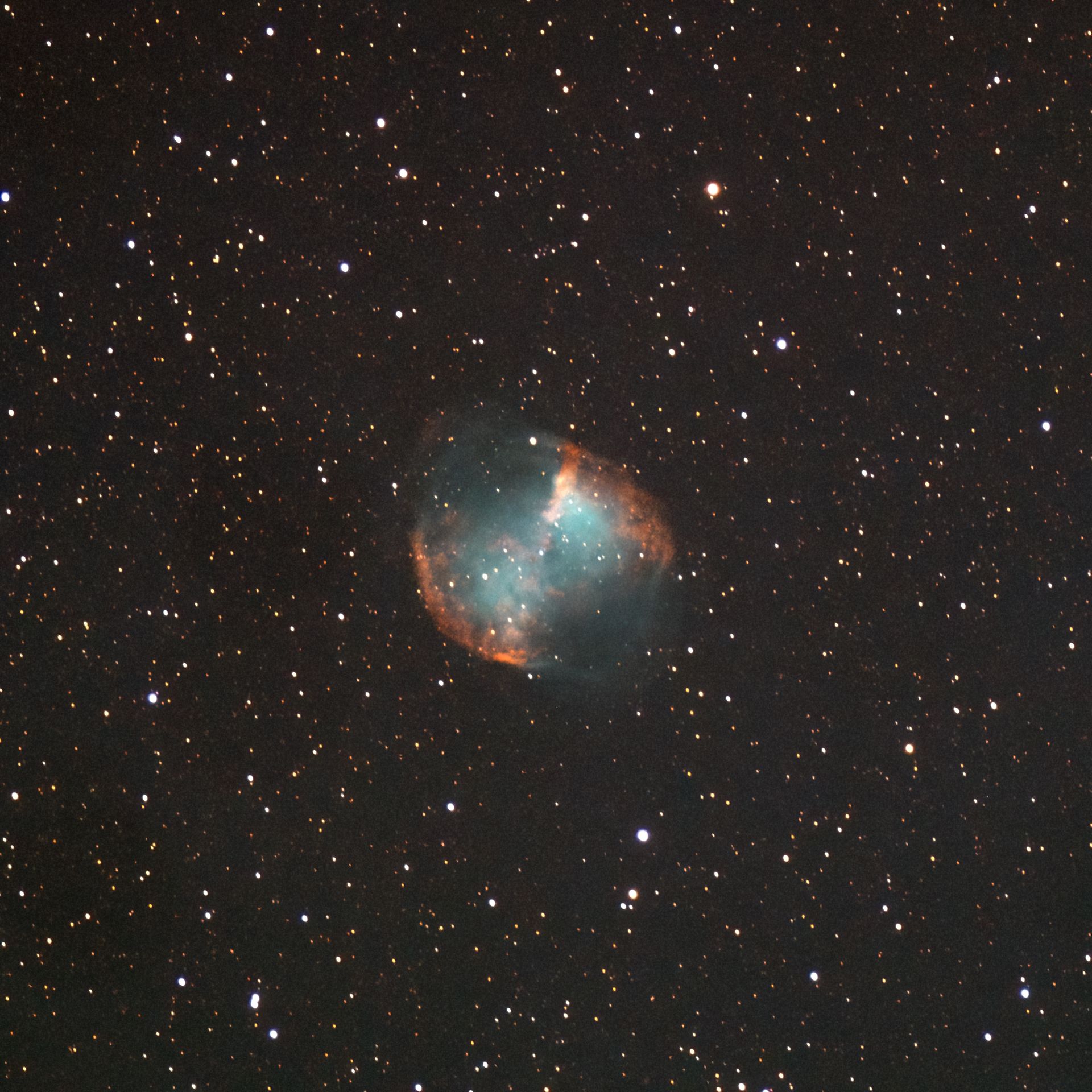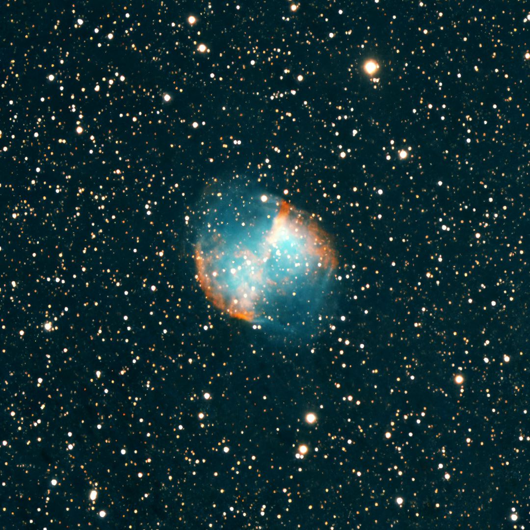 Planetary Nebula RA:19 59.6 DEC:+22 43 Vulpecula Mag. 7.3 Classe 3(2) Surf.Brigh.11.2 Dist.0,376Kpc NGC6853,PK 60-3.1,CS=13.9, Dumbbell nebula PK60-3.1;Lord Rosse drew 18* invl very large AP105 0,8x Fl:480.0mm ZWO ASI294MM Pro T:26.0 Gain:300 Filter: LPRO Exp:2x900s Airmass 1.2 Moon 26.3gg 17.7% ill. (224) |