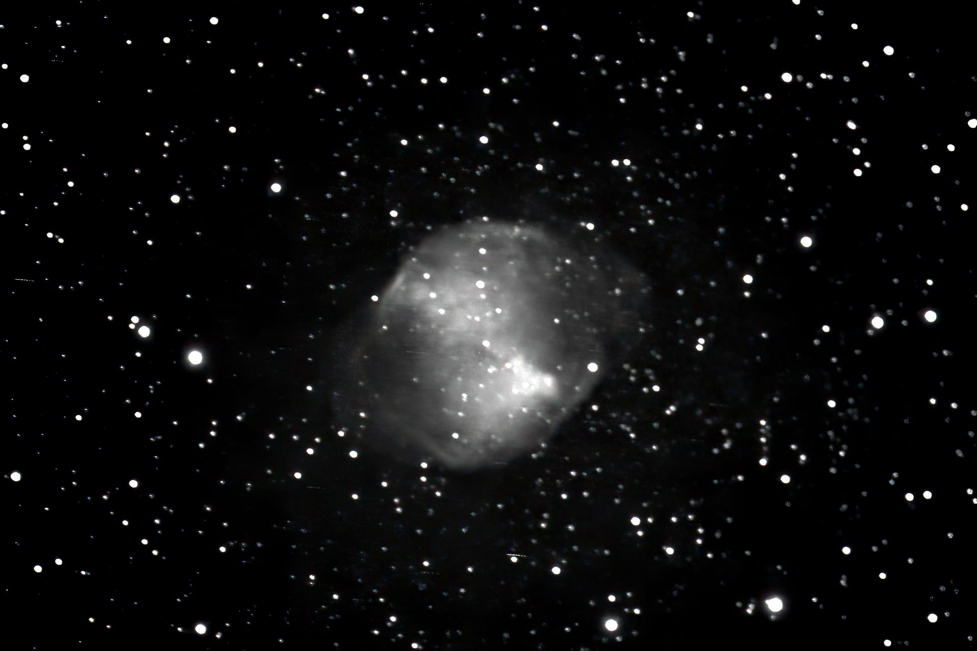 Planetary Nebula RA:19 59.6 DEC:+22 43 Vulpecula Mag. 7.3 Classe 3(2) Surf.Brigh.11.2 Dist.0,376Kpc NGC6853,PK 60-3.1,CS=13.9, Dumbbell nebula PK60-3.1;Lord Rosse drew 18* invl very large (920) |