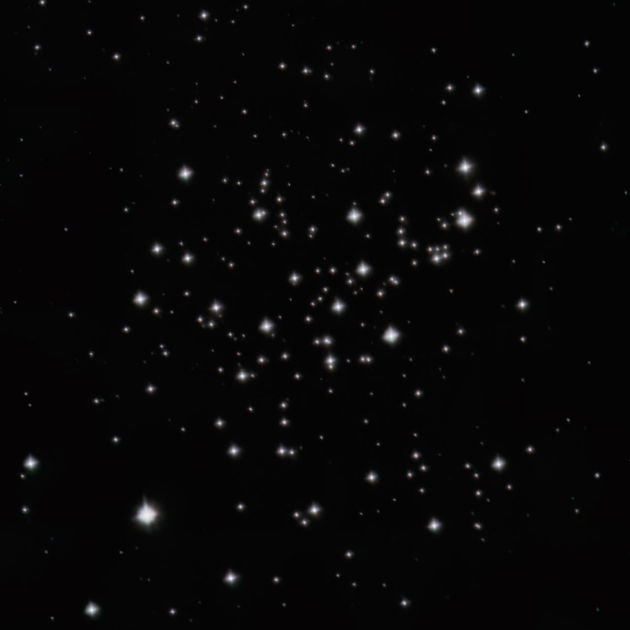 Open Cluster RA:08 51.4 DEC:+11 49 CNC Mag. 6.9 Classe II 2 m Surf.Brigh.13 Dist.0,908Kpc NGC2682,OCL 549 500 memb to 16 mag;Mallas-dark spot near center remarkable object cluster very large little compressed ASKAR 185 Fl:1290.9mm ZWO ASI294MM Pro T:9.4 Gain:300 Filter: None Exp:4x60s Airmass 1.4 Moon 5.5gg 26.7% ill. (149) |