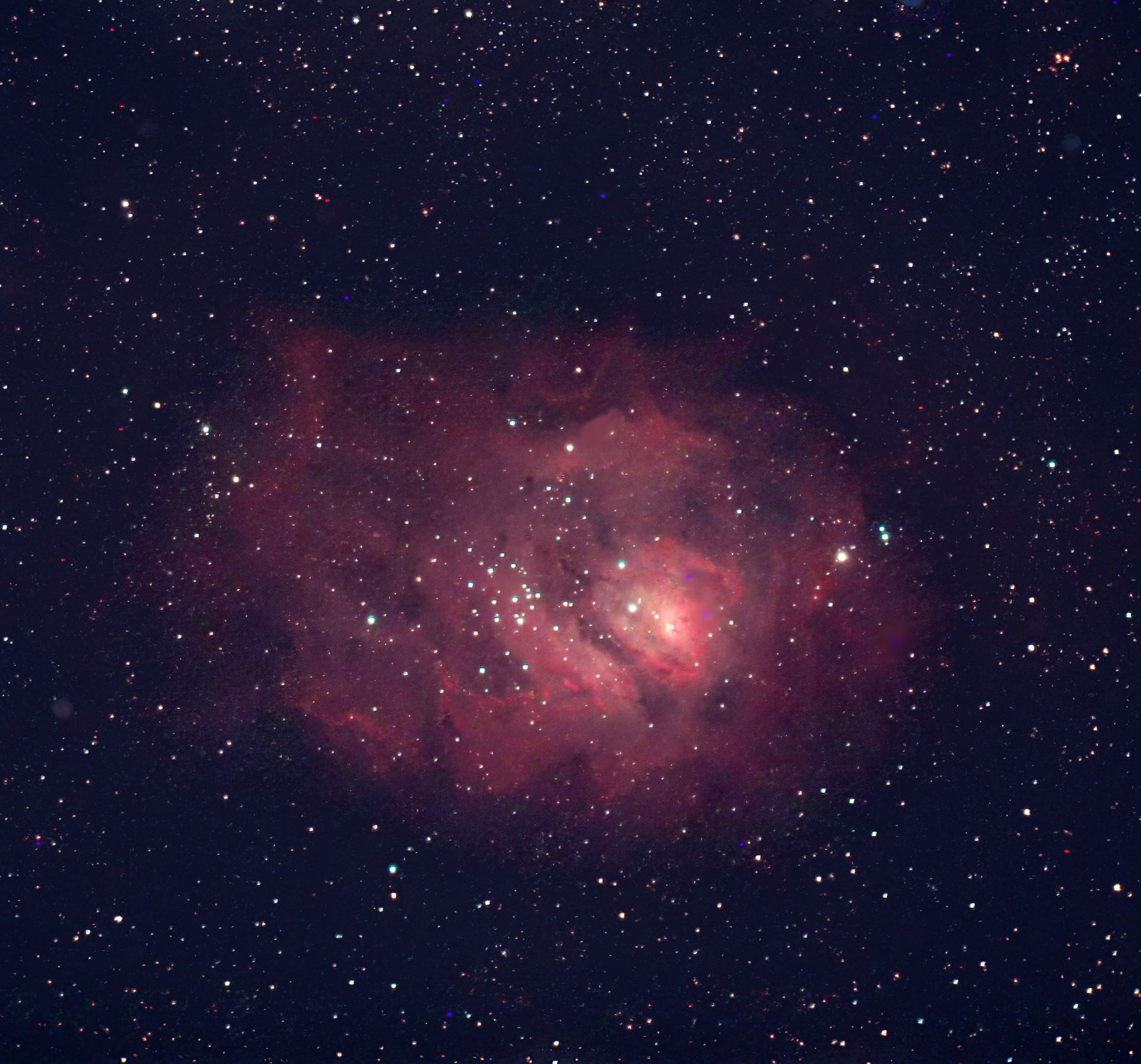 Cluster with Nebulosity RA:18 03.7 DEC:-24 23 Sagittarius Mag. 5.0 Classe E Surf.Brigh.13 Dist.1,25Kpc NGC6523,NGC 6533,LBN 25,Lagoon nebula Lagoon Nebula;Cl NGC 6530 invl;dark lane crosses neb large cluster TEC140 Fl:784.0mm ZWO ASI294MM Pro T:-10.0 Gain:300 Filter: LPRO Exp:900s Airmass 2.9 Moon 20.9gg 72.3% ill. (240) |