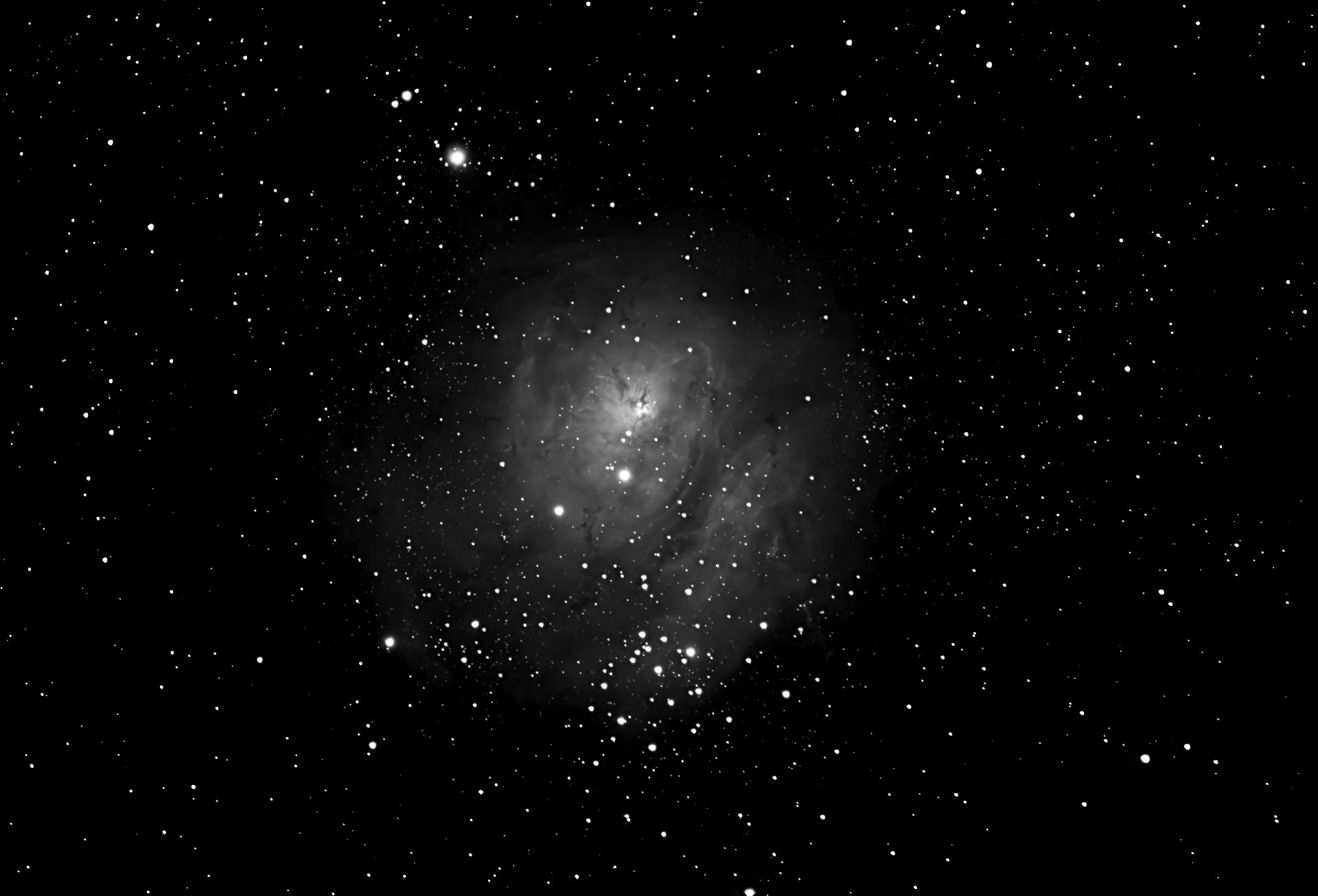 Cluster with Nebulosity RA:18 03.7 DEC:-24 23 Sagittarius Mag. 5.0 Classe E Surf.Brigh.13 Dist.1,25Kpc NGC6523,NGC 6533,LBN 25,Lagoon nebula Lagoon Nebula;Cl NGC 6530 invl;dark lane crosses neb large cluster INTES ALTER M500 f/10 Fl:1221.9mm ZWO ASI294MM Pro T:-10.0 Gain:300 Filter: Ha Exp:3x900s Airmass 2.7 Moon 26.3gg 13.6% ill. (84) |