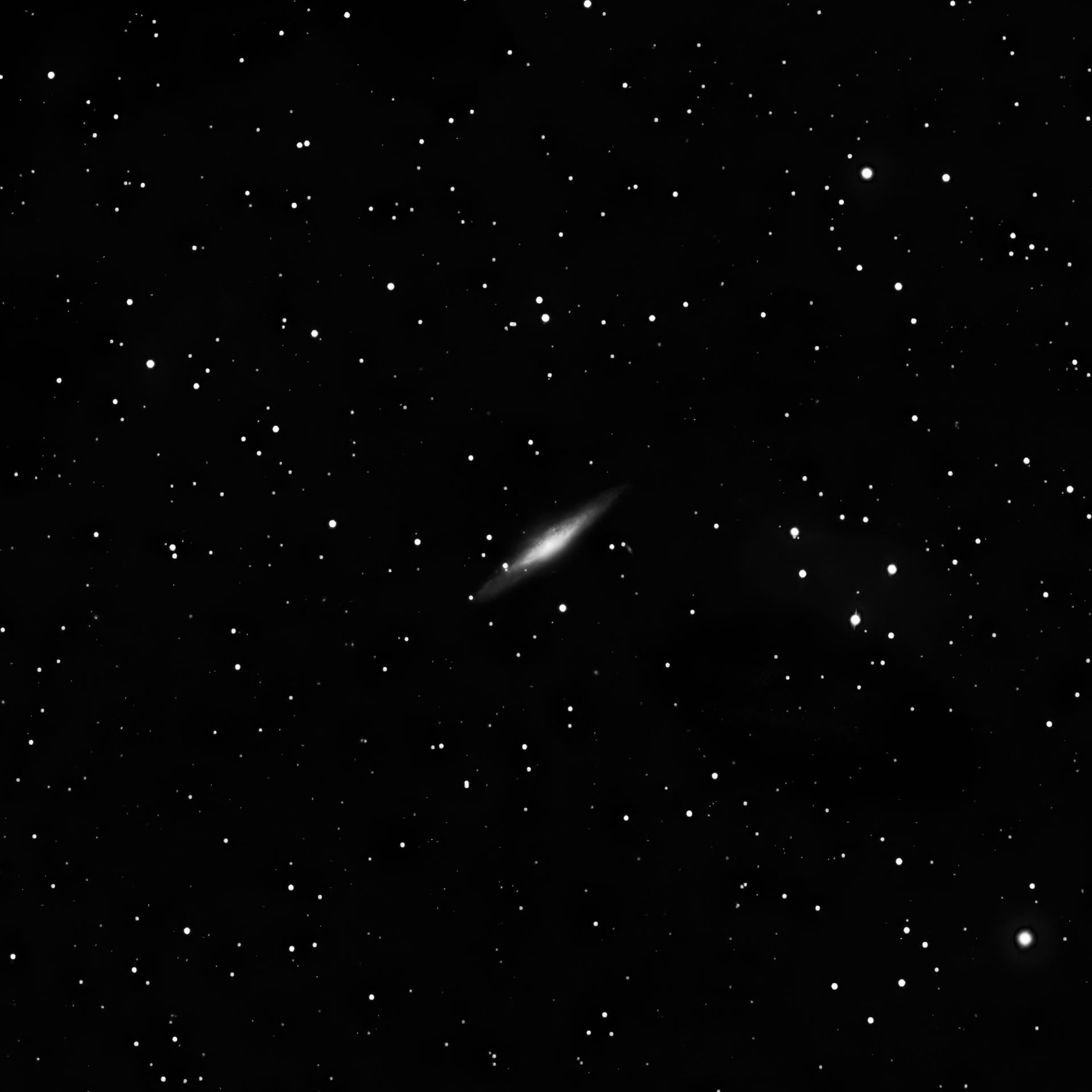 Very bright, Very large, Very much extended 39°, Gradually Magnitude Brighter Middle (or in the middle) Galaxy RA:08 52.7 DEC:+33 25 Lynx Mag. 9.8 Classe Sb Surf.Brigh.12,9 Redshift Z=0,001371 Speed 411 km/s Dist.10,18Mpc PGC 24930 UGC 4641,MCG 6-20-11,CGCG 180-17,KUG 0849+336 H I 200;peanut-shaped bulge;many filam; arm w dk lanes 1 side very large ASTRO-PHYSICS 105 TRAVELER EDF f/5.8 Fl:659.2mm ZWO ASI294MM Pro T:-10.0 Gain:300 Filter: None Exp:9x900s Airmass 1.8 Moon 8.0gg 47.0% ill. (4) |