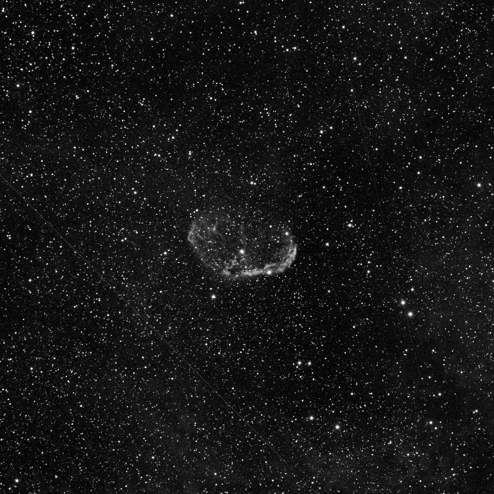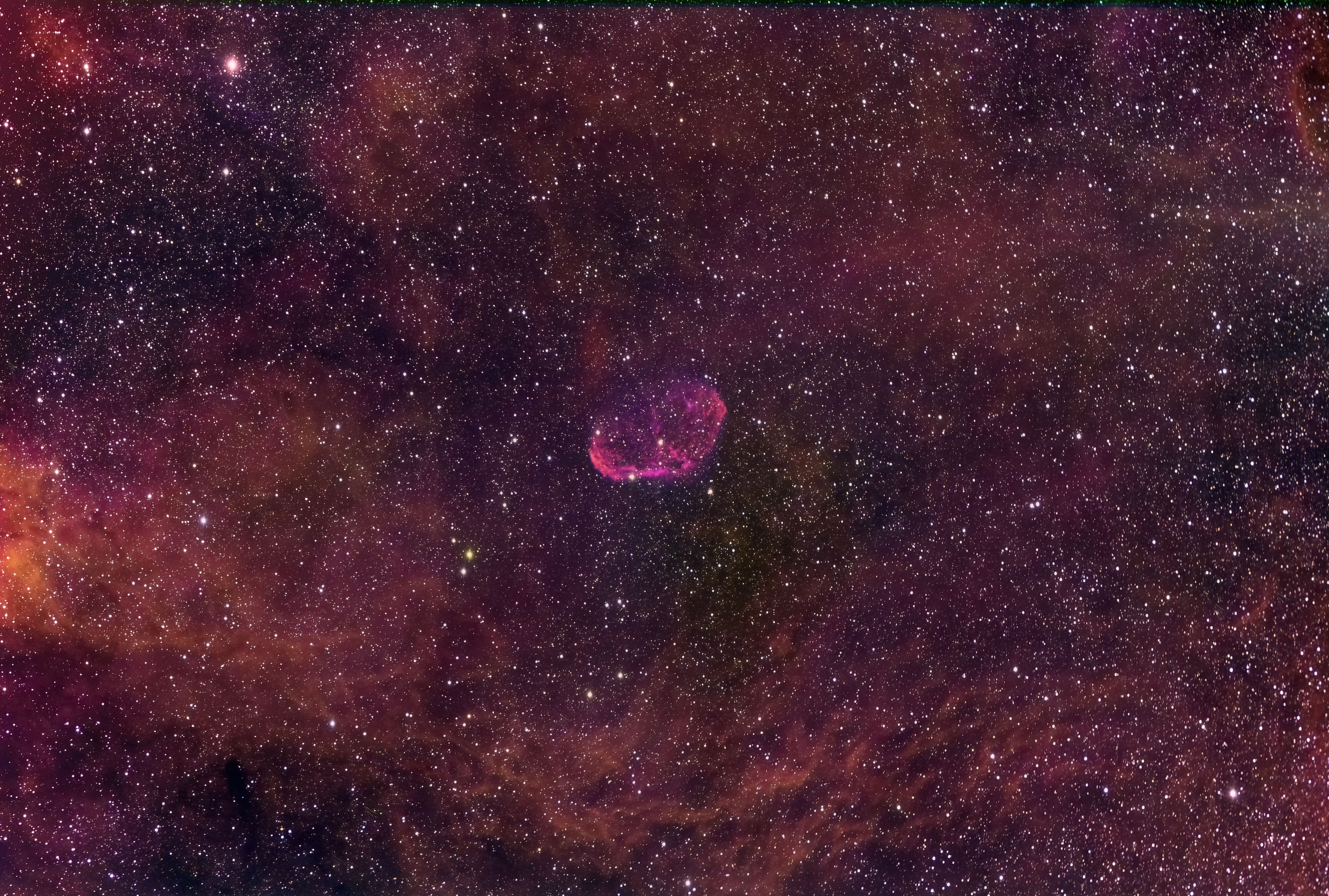 Faint, Very large, Very much extended, Double star Attached Bright Nebula RA:20 12.1 DEC:+38 21 Cygnus Mag.10.0 Classe E Dist.1,45Kpc LBN 203,Sh2-105,Crescent nebula H IV 72;Crescent Neb;Wolf-Rayet * invl faint very large attached RASA 8 Fl:400.0mm ZWO ASI533MC Pro T:-10.1 Gain:300 Filter: None Exp:3600s Airmass 1.1 Moon 27.3gg 10.4% ill. (221) |