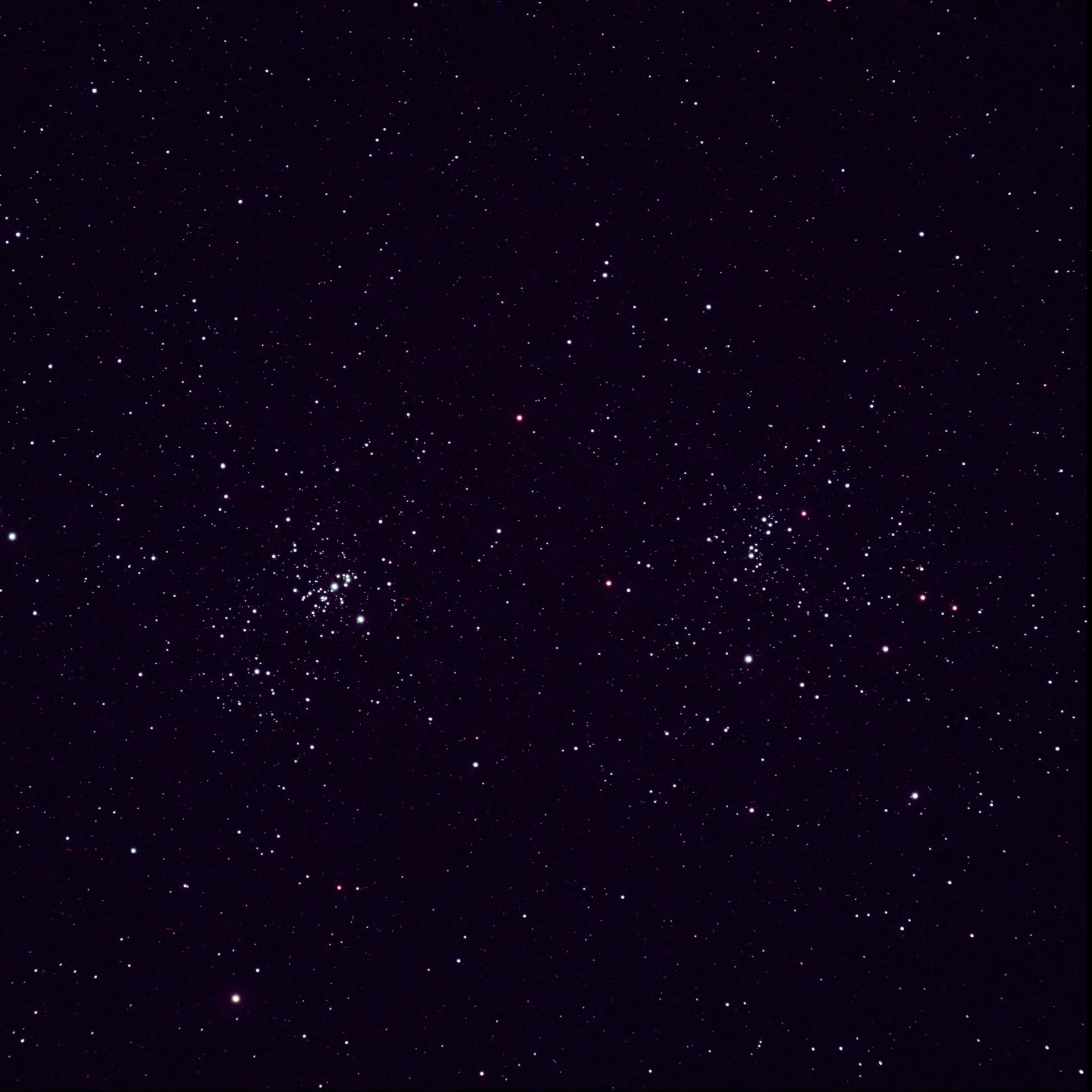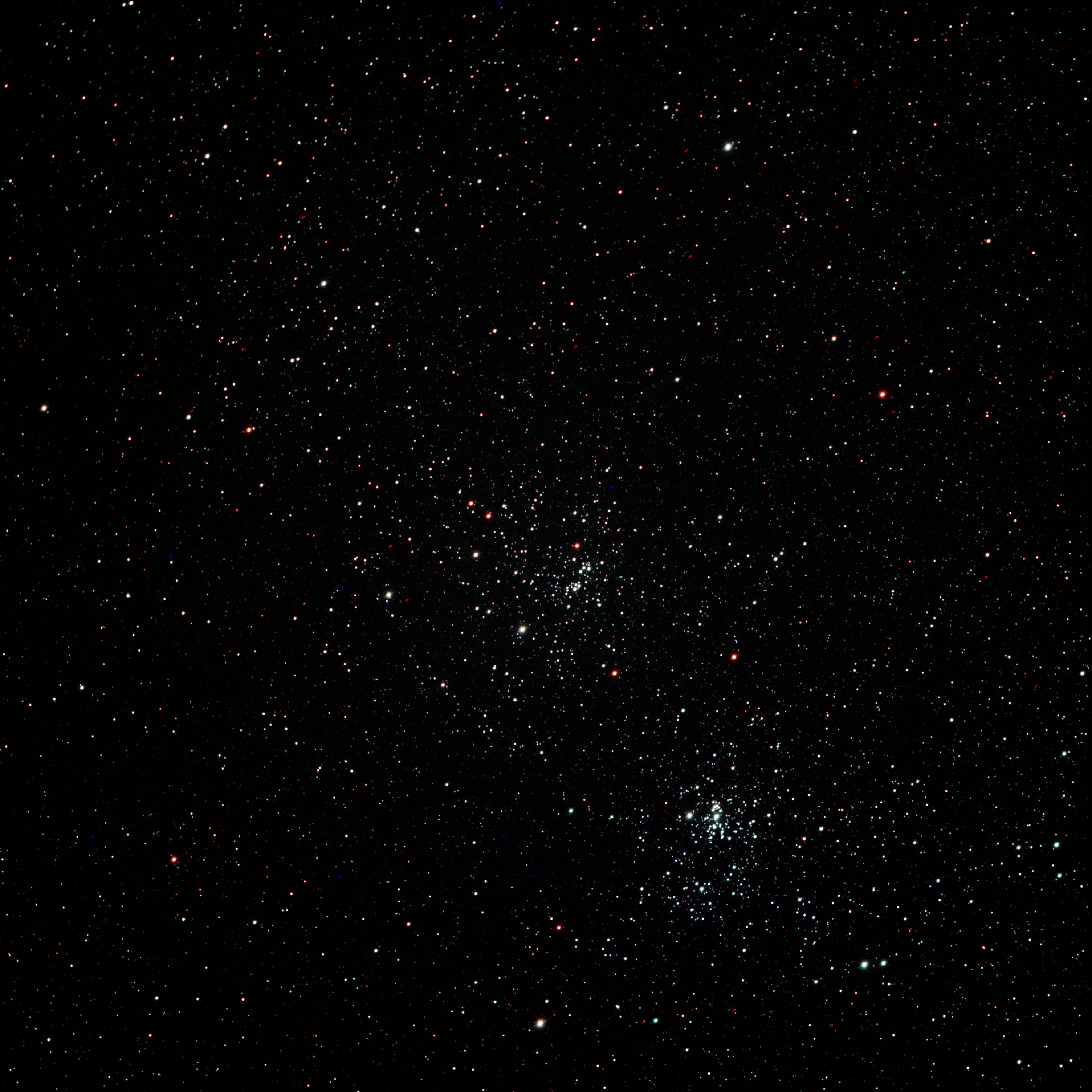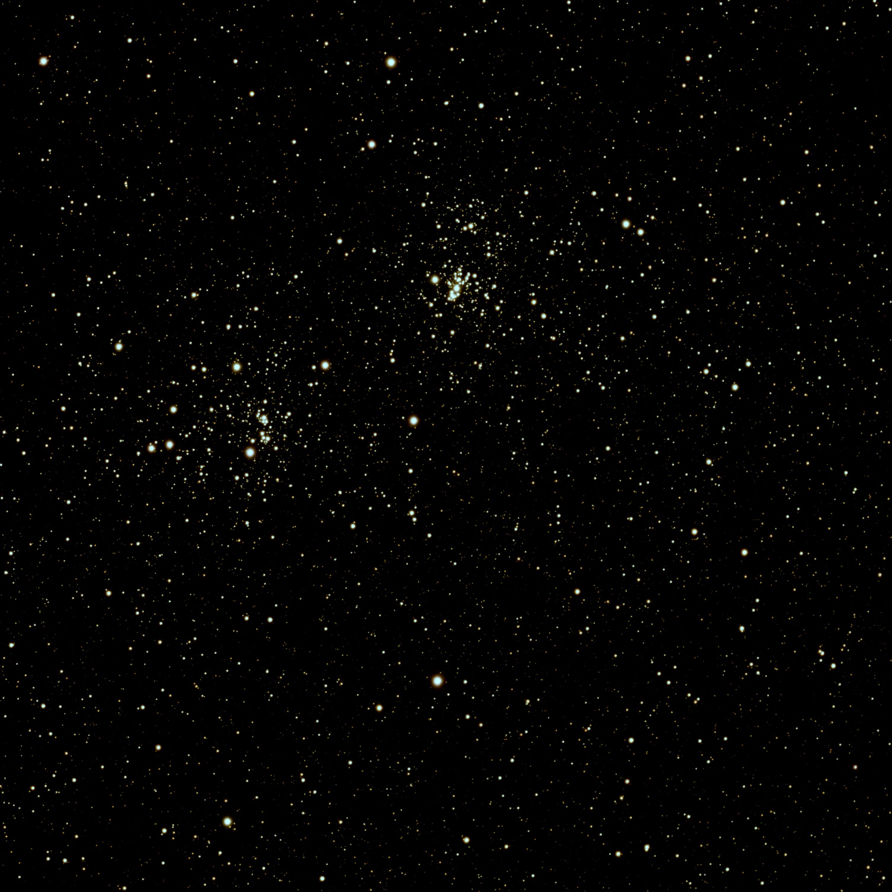 Remarkable Cluster, Very large, Very Rich, Resolvable (mottled, not resolved) uBrighter y Star Middle (or in the middle) Open Cluster RA:02 22.5 DEC:+57 09 Perseus Mag. 6.1 Classe I 3 r Dist.2,345Kpc OCL 353,Double cluster H VI 34;chi Per;in Per OB1;Double Cluster w NGC 869 cluster very large SHARPSTAR 65Q f/6.5 Fl:420.0mm ZWO ASI294MM Pro T:-10.0 Gain:300 Filter: LPRO Exp:4x300s Airmass 2.2 Moon 9.3gg 61.3% ill. (234) |