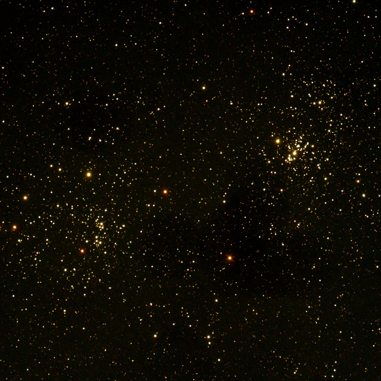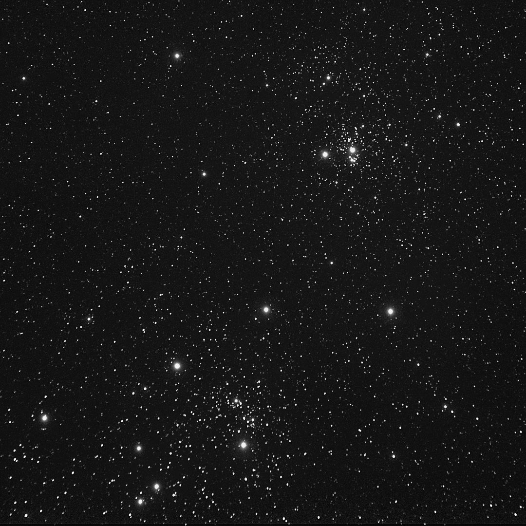 Remarkable Cluster, Very large, Very Rich, Resolvable (mottled, not resolved) uBrighter y Star Middle (or in the middle) Open Cluster RA:02 22.5 DEC:+57 09 Perseus Mag. 6.1 Classe I 3 r Dist.2,345Kpc OCL 353,Double cluster H VI 34;chi Per;in Per OB1;Double Cluster w NGC 869 cluster very large ASKAR V 60 REDUCER f/4.5 Fl:275.4mm ZWO ASI533MC Pro T:-10.0 Gain:300 Filter: None Exp:3x300s Airmass 1.3 Moon 6.8gg 39.5% ill. (35) |