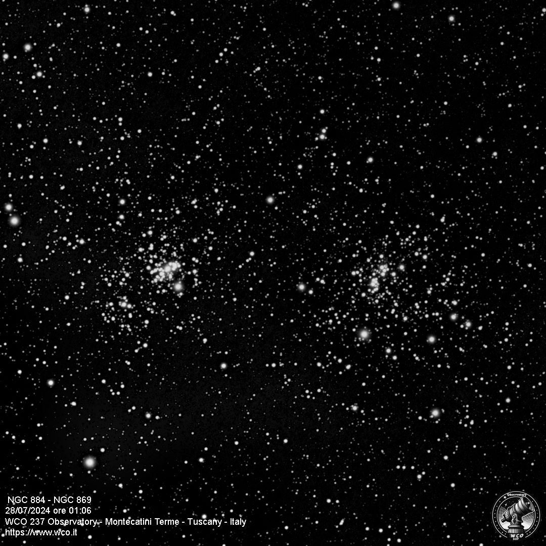Remarkable Cluster, Very large, Very Rich, Resolvable (mottled, not resolved) uBrighter y Star Middle (or in the middle) Open Cluster RA:02 22.5 DEC:+57 09 Perseus Mag. 6.1 Classe I 3 r Dist.2,345Kpc OCL 353,Double cluster H VI 34;chi Per;in Per OB1;Double Cluster w NGC 869 cluster very large BORG 101ED f/6.3 Fl:515.2mm Reducer: WO 0,8x ZWO ASI294MM Pro T:5.3 Gain:300 Filter: C1 Exp:180s Airmass 1.6 Moon 1.3gg 0.2% ill. (749) |